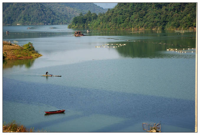 不知過(guò)了多久!也不知穿過(guò)了多少座隧道!我依然沉浸在遠(yuǎn)離凡塵喧囂的鬧市、相伴于群山峻嶺,四季如春綠油油松柏夾雜著少許紅楓秋葉的幻想之中,間或在轉(zhuǎn)瞬即逝日薄西山的余暉照映下熠熠生輝!此時(shí)此刻的我已經(jīng)是到了忘我的最高境界,腦中忽然閃過(guò)歐陽(yáng)老翁的一句至理名言——【醉翁之意不在酒,而在乎山水之間!】這句話用在此處真的是妙不可言!我那萬(wàn)千思緒隨著飛馳的車輪早已飄到九霄云外,暗自為窗外如畫如詩(shī)的景象所迷惑、所陶醉、所依戀...!猛然間聽到一句非常熟悉且溫暖的話——爸爸!快看!到了磨子潭風(fēng)景觀賞區(qū)了!我才恍然如夢(mèng)驚醒,朝遠(yuǎn)處向下望去好一個(gè)一望無(wú)際的“磨子潭”!其潭水清澈,魚影可現(xiàn);微風(fēng)襲來(lái),碧波蕩漾;譚中游筏,漁歌互答;這時(shí)女兒也詩(shī)意助興了!滿懷深情地吟誦——“磨子潭水-深千尺,不及‘爸媽’-送我情!”這句真是太絕了!女兒漸漸地長(zhǎng)大了,懂得感恩戴德了。車子終于快要鉆進(jìn)最后一個(gè)隧道了,我也不知道它是排第幾?感覺今天好像是專乘“高速隧道”之旅了?!在快要進(jìn)入末了隧道的一霎那,我還特留戀地回頭朝窗外俯視一下,只見磨子潭中那無(wú)數(shù)的‘網(wǎng)箱’把整個(gè)潭水劃分成大小不等的方塊,好像一張碩大無(wú)比殘缺不全的圍棋盤面撒在幽深的譚中,我還來(lái)不及細(xì)數(shù)就立刻消失在我難以忘卻的視線中.....!